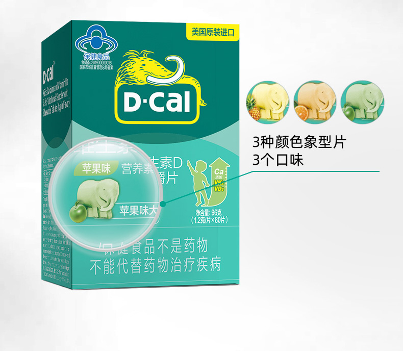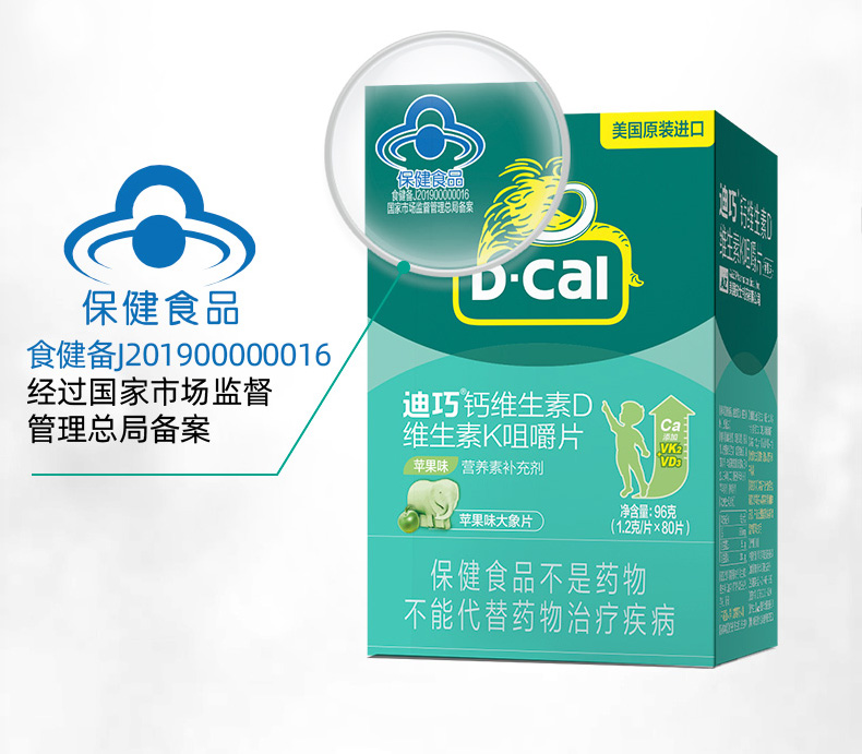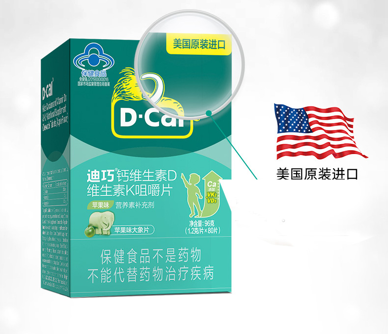 迪巧钙维生素D维生素K咀嚼片80片(苹果味)儿童钙片青少年小儿碳酸钙dk补钙美国进口