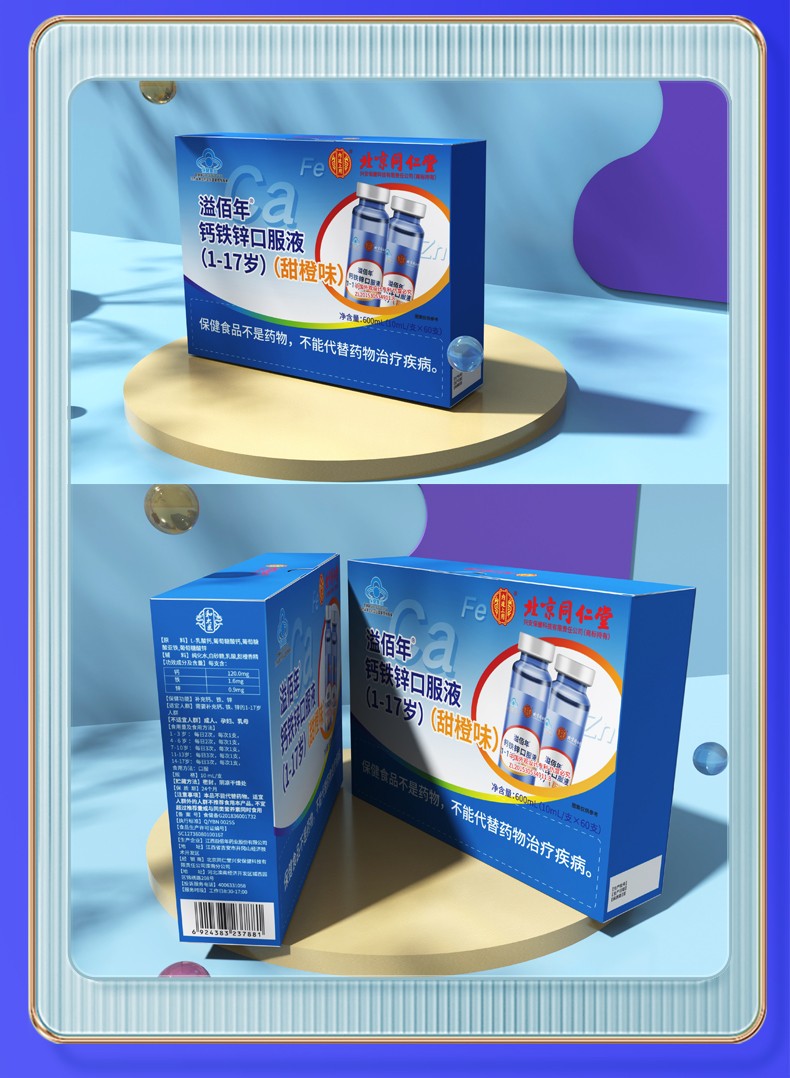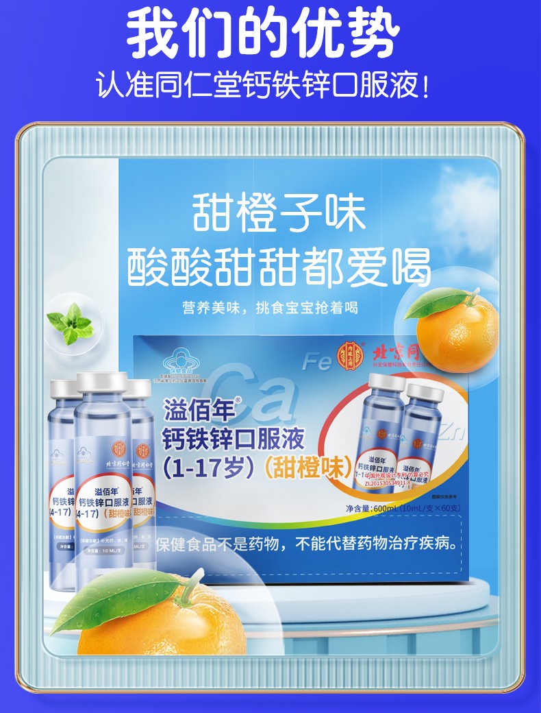 北京同仁堂 钙铁锌口服液60支装 儿童青少年宝宝补钙铁锌液体钙