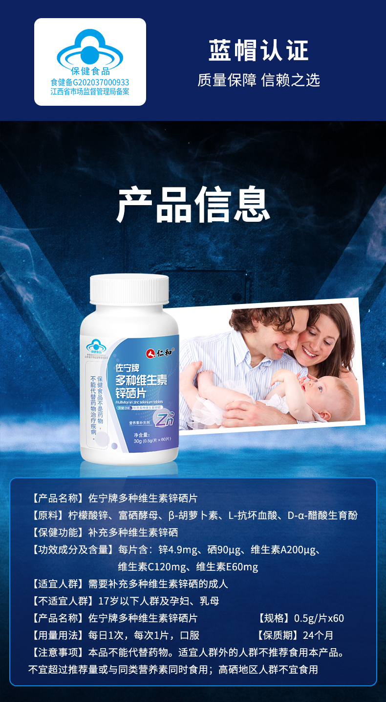 仁和佐宁牌多种维生素锌硒片30g(0.5g/片*60片)*2瓶 男士备孕 补充多种维生素锌硒