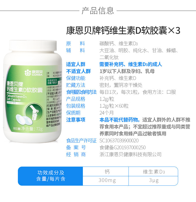 康恩贝牌钙维生素D软胶囊60片*3瓶 D3男女成人中老年儿童补钙VD液体钙